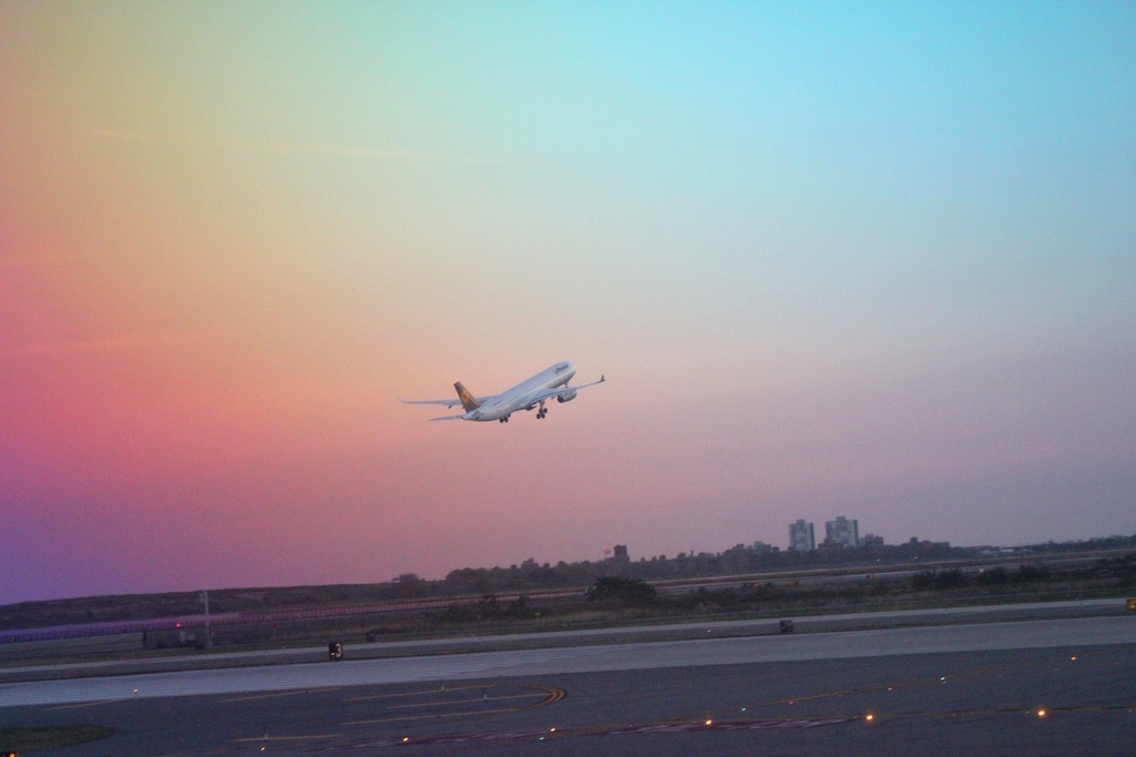 Plane starting at sunset