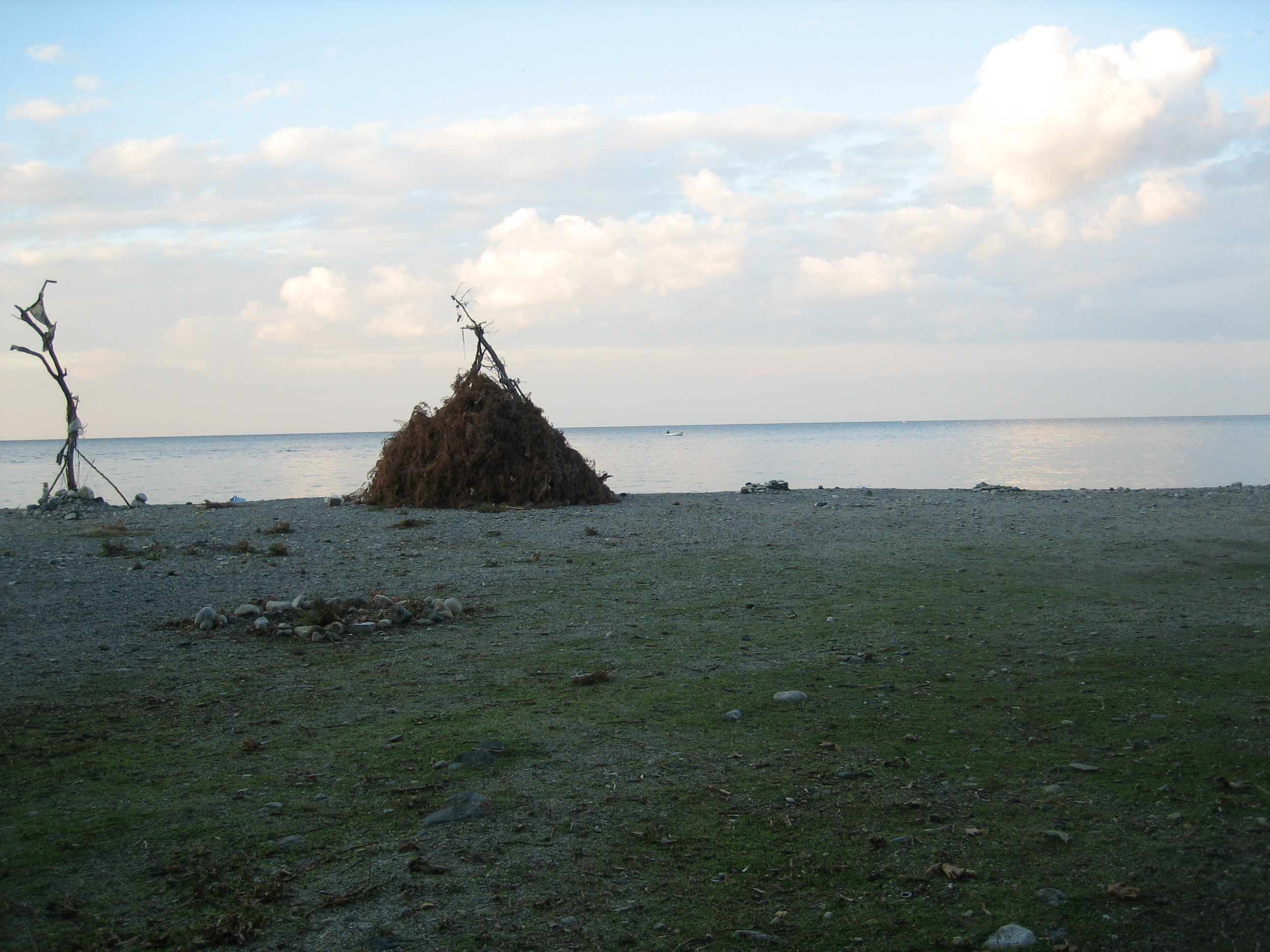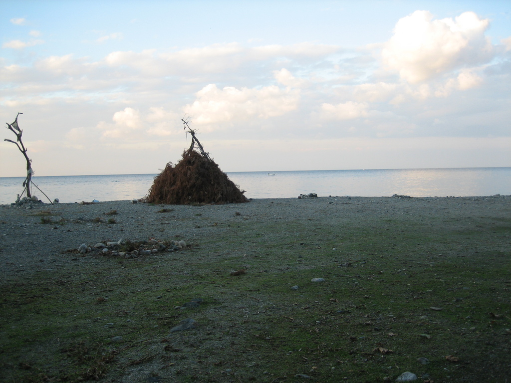 description:Pile of dry leaves heaped on the barren shore of the mighty river.