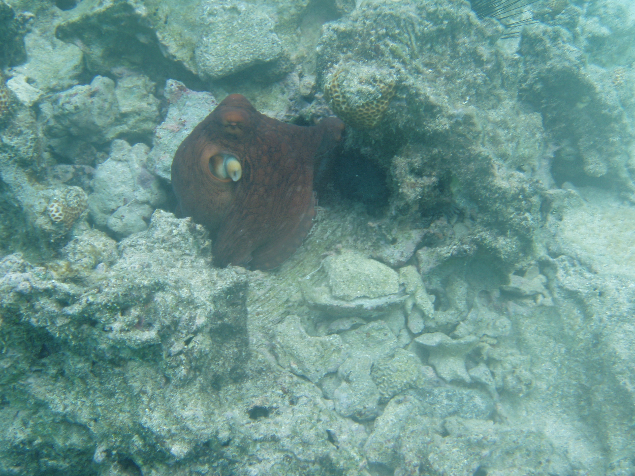 description:A red colored octopus is coming out of it's snug hide out.