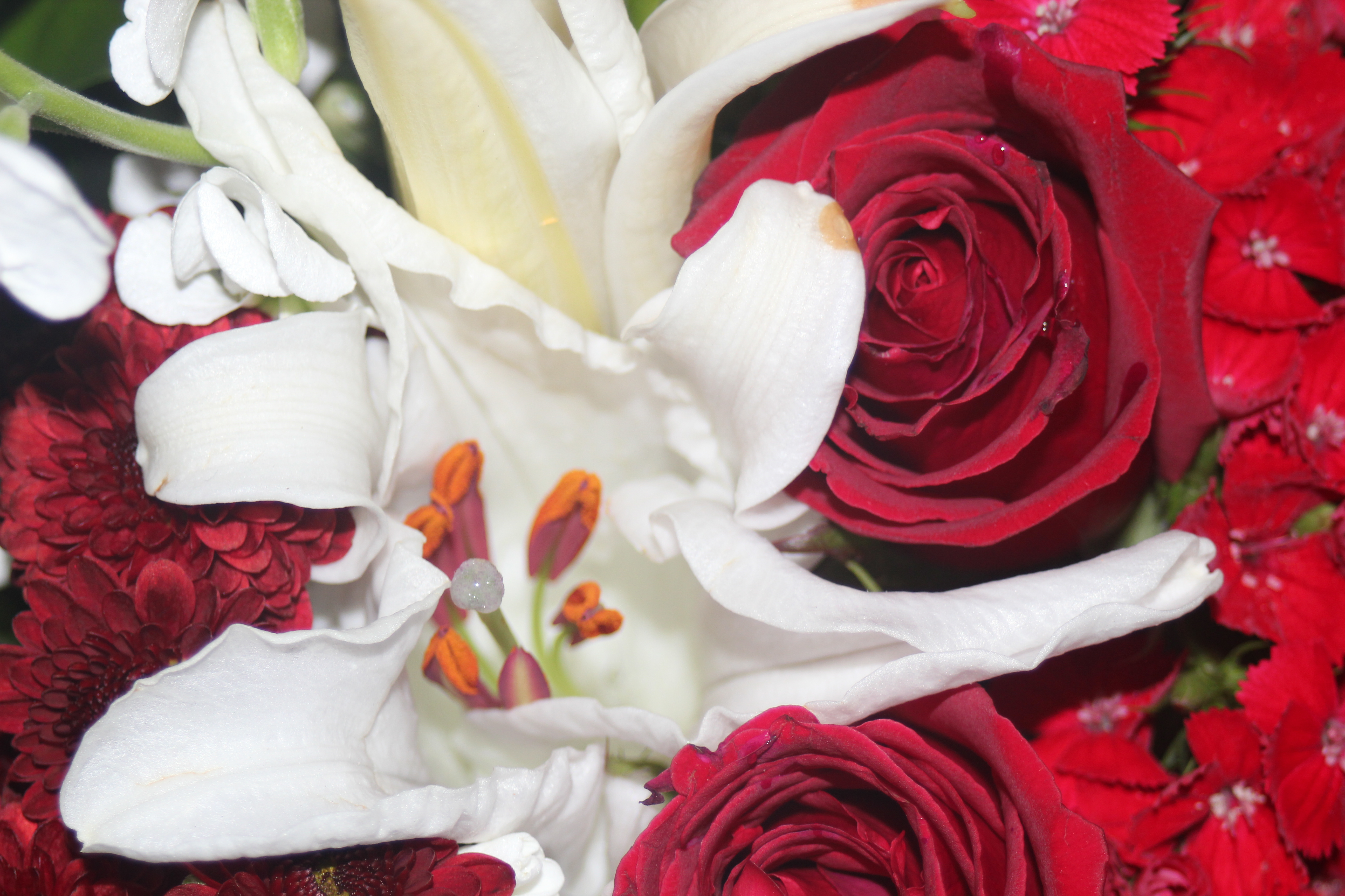 description:White lilies with red flowers like rose and others is great combination.
