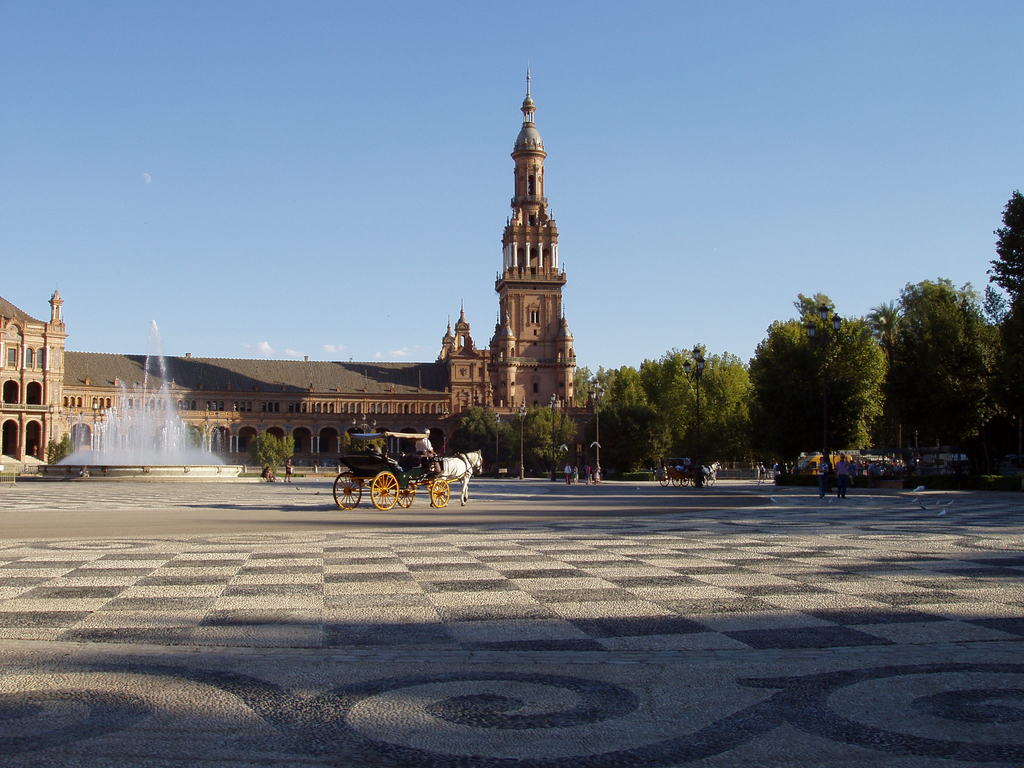 description:A horse carriage is riding across the cemented field in front of the palace.