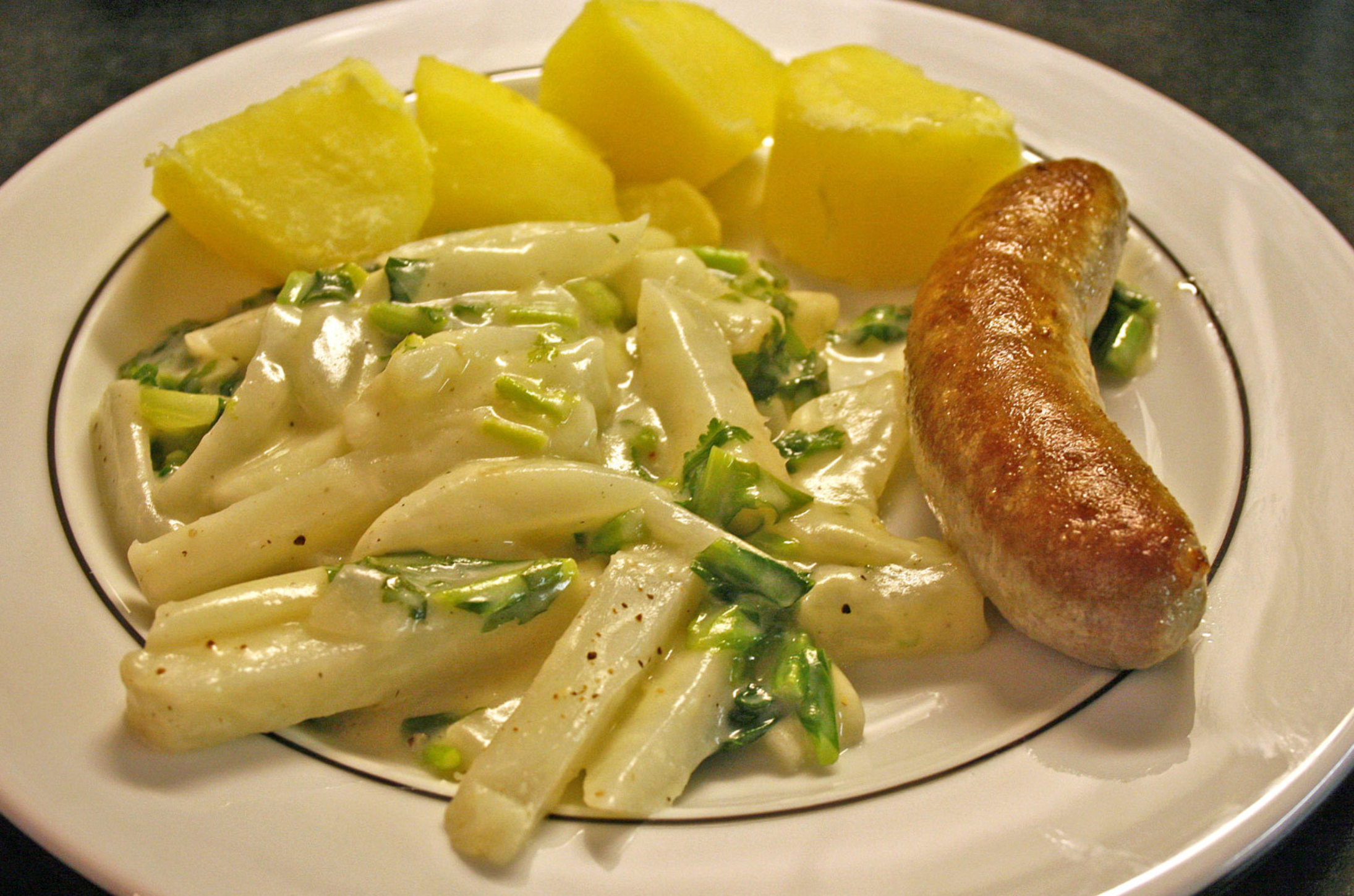 description:Mairubchen served with sausage and potatoes.