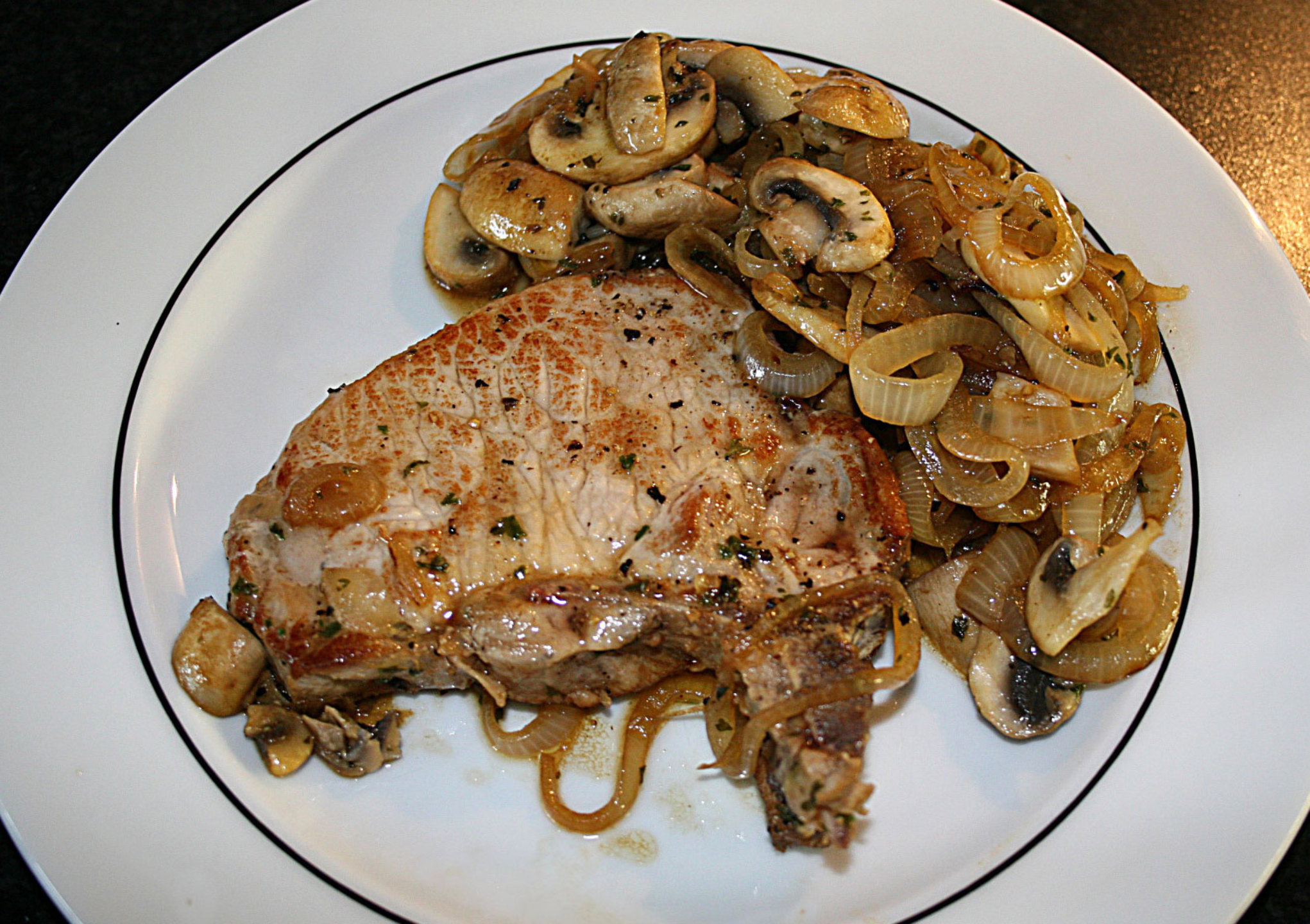 description:Meat chop served with fried onions and mushrooms.