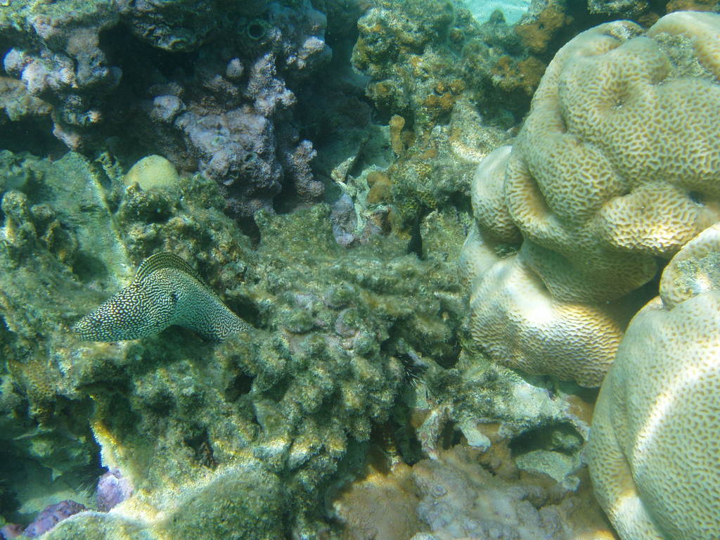 description:A camouflaged moraine in the beautiful corals of the reef. Be aware it's a poisonous animal waiting for prey.