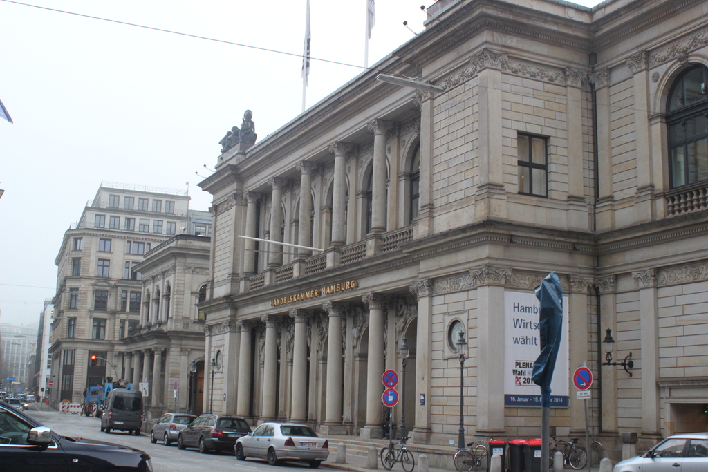 description:The mansion of Hamburg's chamber of commerce next to a busy street.