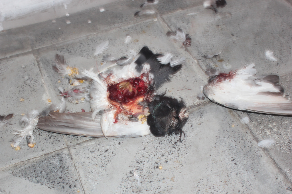 description:The body feathers are scattered allover the floor near the dead bird.