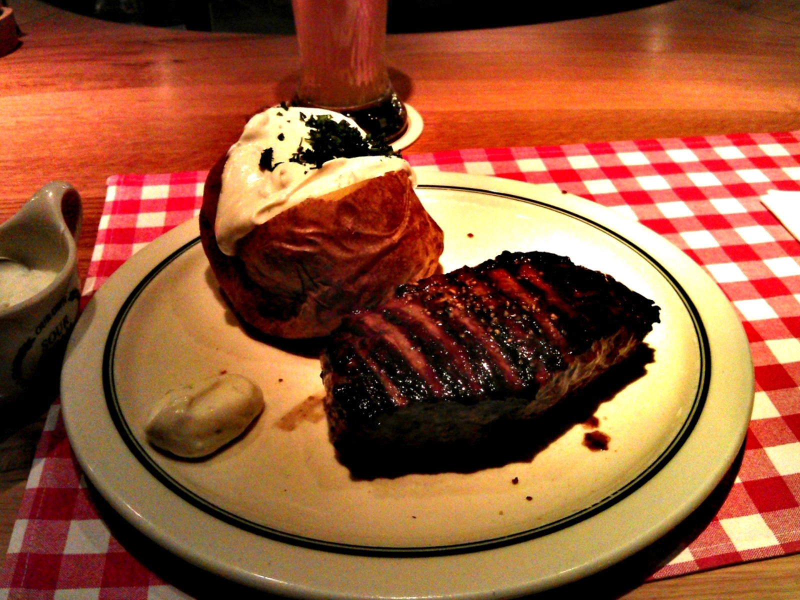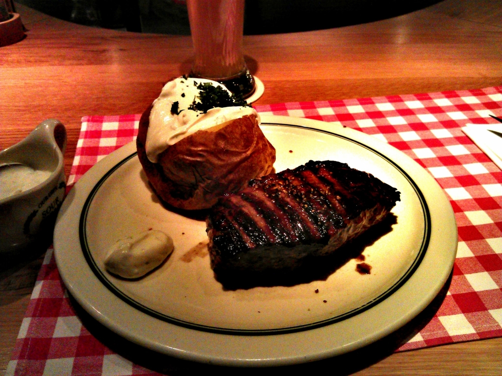 description:Steak served with backed potatoes and white cream sauce.